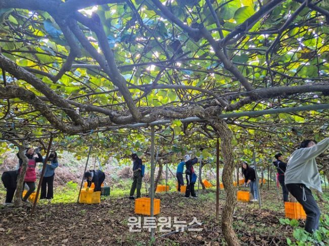 이날 오후 1시 30분부터 5시 30분까지 참다래 수확과 운반, 주변 환경 정비 등 다양한 작업에 참여하며 구슬땀을 흘렸다.