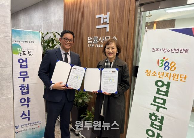 (원투원뉴스) 전주시청소년상담복지센터는 5일 법무법인 격과 위기청소년의 권익 보호와 법률 지원을 위한 ‘법률자문 전문서비스 구축 업무협약’을 체결했다.