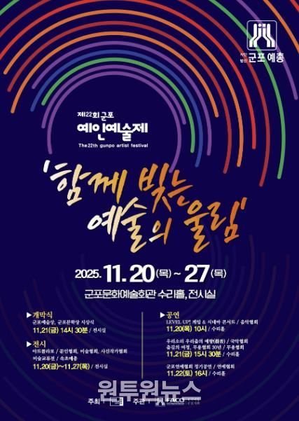 (원투원뉴스) 2025년 제22회 군포 예인예술제가 11월 20일부터 27일까지 군포문화예술회관 전시실과 수리홀에서 8일간 진행된다.