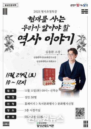 (원투원뉴스) 달성군립도서관은 오는 11월 29일 열리는 심용환 소장의 특강 ‘현재를 사는 우리가 알아야 할 역사 이야기’ 참가자를 11일부터 모집한다고 밝혔다.