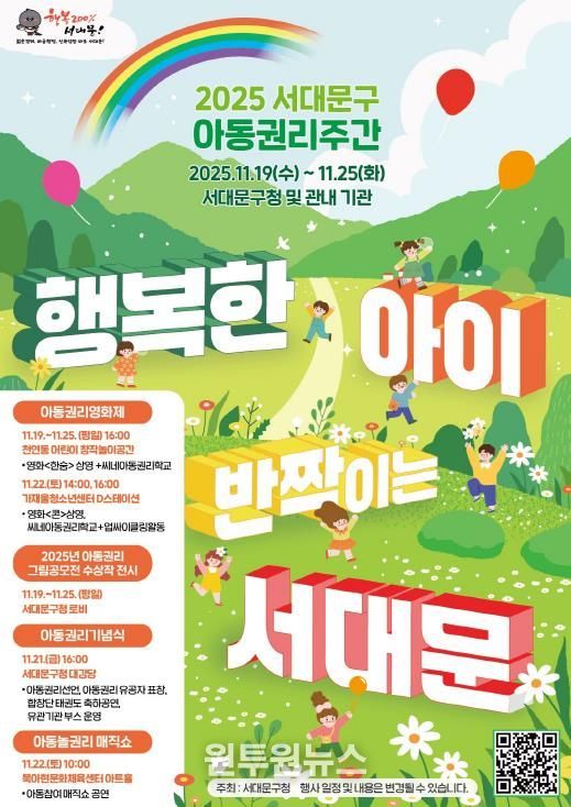 (원투원뉴스) 서대문구가 아동 권리 보호와 증진을 위해 이달 19일부터 25일까지 구청 로비와 강당, 천연동 어린이 창작놀이공간, 북아현문화체육센터 등에서 ‘아동권리주간’행사를 진행한다.