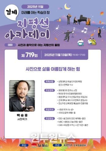 (원투원뉴스) 김제시는 오는 13일 제719회 지평선아카데미에 사진작가로 활동 중인 백승휴 포토테라피 연구소 소장을 초청해 “사진으로 삶을 아름답게 하는 힘”이라는 주제로 강연을 진행한다고 밝혔다.