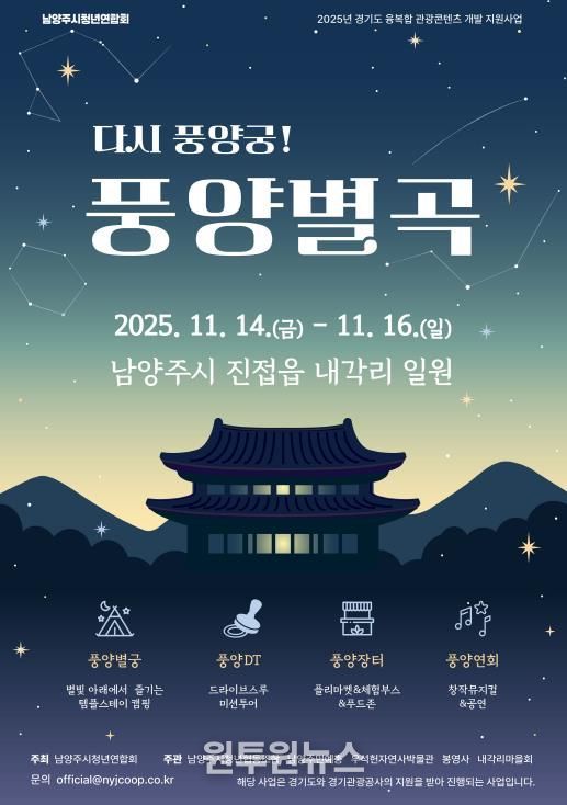 또 ‘풍양장터(플리마켓·푸드존)’, ‘풍양연회(뮤지컬·공연)’ 등 부대행사도 마련, 다양한 즐길거리와 볼거리를 제공할 예정이다. 사전 예약 등 전체 프로그램에 대한 자세한 내용은 ‘풍양별곡’ 인스타그램 계정(@pystar2025)을 통해 확인 가능하다.