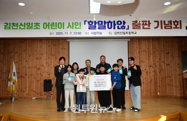 (원투원뉴스) 김천복지재단(이사장 배낙호)은 지난 7일, 김천 신일초등학교(교장 채득원) 어린이 작가 22명으로부터 시집 『할말하않』 출판 수익금 성금 30만 원을 전달받았다고 밝혔다.
