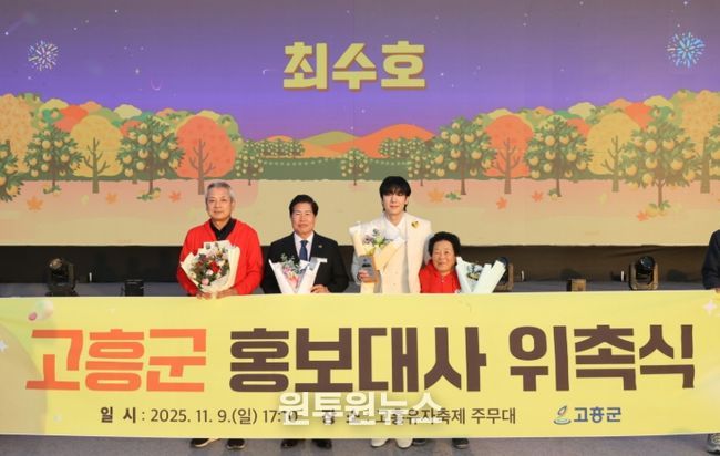 가수 최수호는 “아버지의 고향인 고흥에서 첫 번째 홍보대사를 맡게 되어 뜻깊다”며 “트로트 가수로 왕성한 활동과 더불어 천혜의 자연환경과 우주항공 중심도시로 거듭나고 있는 고흥을 널리 알리겠다”고 당찬 포부를 밝혔다.