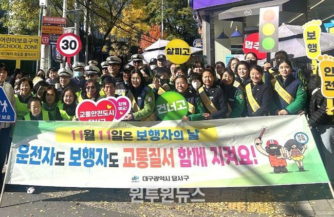 (원투원뉴스) 대구 달서구는 ‘2025년 보행자의 날(11월 11일)’을 맞아 11월 10일 성서노인종합복지관 앞 삼거리(노인보호구역)에서 ‘보행안전 릴레이 캠페인(신호등 퍼포먼스)’을 개최했다.