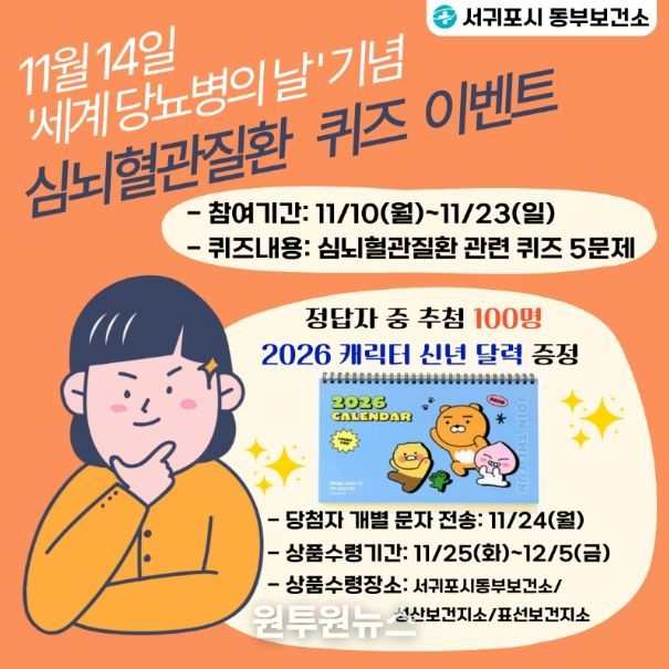 (원투원뉴스) 서귀포시 동부보건소는 2025년 ‘세계 당뇨병의 날’을 기념하여 11월 10일부터 11월 23일까지 14일간 모바일 앱 ‘워크온’을 활용한 심뇌혈관질환 퀴즈 이벤트를 운영한다.