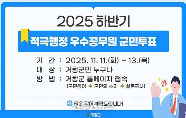 (원투원뉴스) 거창군은 오는 11일부터 13일까지 ‘2025년 하반기 적극행정 우수공무원 및 우수사례’를 선정하기 위한 군민 온라인 투표를 실시한다.