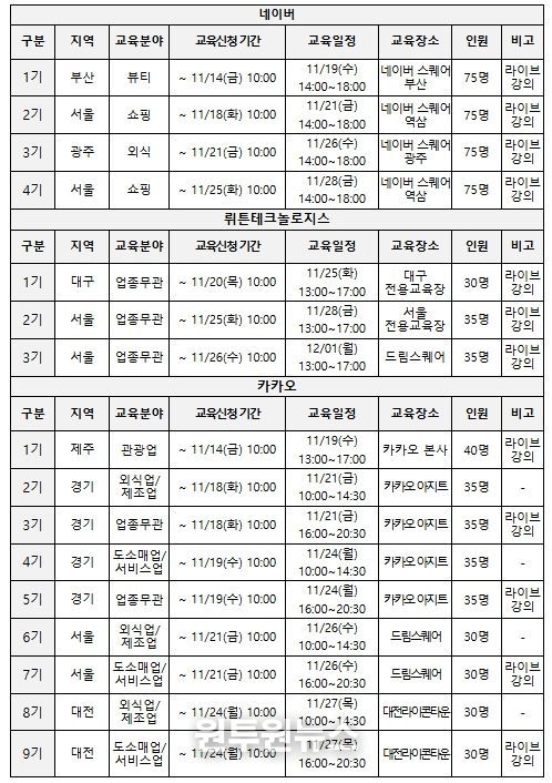 국내의 대표적인 인공지능(AI) 기업인 네이버, 뤼튼테크놀로지스, 카카오(이상 가나다 순)가 교육기관으로 참여하며, 각 기관이 직접 기획한 교육과정(커리큘럼)에 따라 현장 교육과 온라인 교육이 함께 진행될 예정이다.