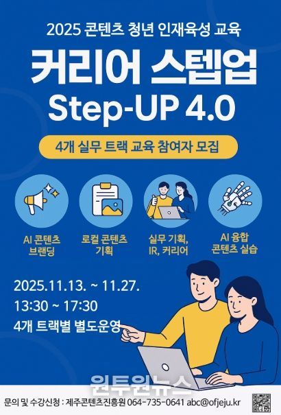 (원투원뉴스) 제주콘텐츠진흥원(원장 강민부)은 지역 기업 및 청년 일자리 창출을 위한 「제주 콘텐츠 청년 일자리 빌드업 지원사업」의 일환으로 도내 청년을 대상으로 한 실무형 인재육성 교육 “커리어 스텝업(Step-UP) 4.0”을 11월 13일부터 27일까지 운영한다.