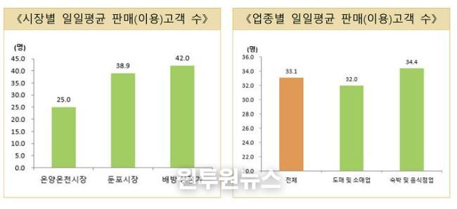 업종별로는 ‘숙박 및 음식점업’의 일일 평균 고객 수가 34.4명으로 가장 많았고, 연평균 매출액도 1억 7720만 원으로 가장 높았다.