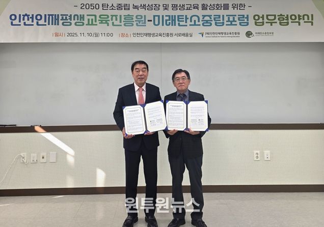 (원투원뉴스) 2025년 11월 10일, 인천인재평생교육진흥원과 미래탄소중립포럼이 탄소중립 시민교육과 평생교육 활성화를 위한 업무협약(MOU)을 체결했다.