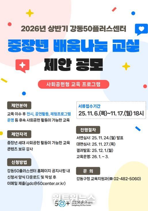 (원투원뉴스) 서울 강동구는 중장년 세대가 배움을 통해 지역과 소통하고, 경험을 지역 발전에 활용할 수 있도록 2026년 상반기 강동50플러스센터 ‘중장년 배움나눔 교실’ 제안 공모를 실시한다고 11일 밝혔다.