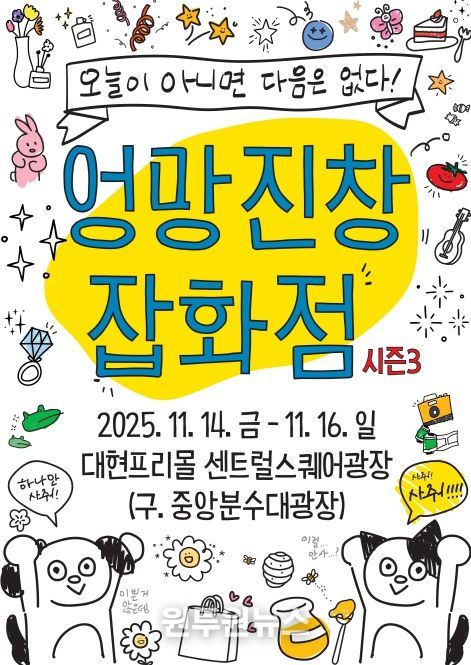 (원투원뉴스) 대구 중구는 14일부터 16일까지 대현프리몰 중앙광장(1호선 중앙로역 지하상가)에서 청년 스타트업 프리마켓 ‘엉망진창 잡화점 시즌3’을 개최한다.
