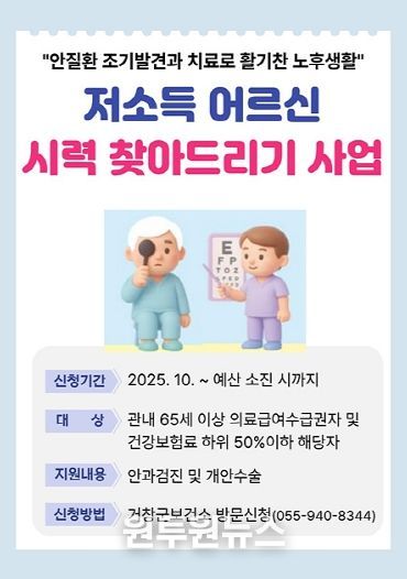 지원대상은 거창군에 거주하는 의료급여수급권자와 건강보험료 기준(직장가입자 127,500원 이하, 지역가입자 57,000원)에 해당하는 65세 이상 노인이다. 군은 안과검진과 개안수술을 지원함으로써 경제적 부담을 덜어드리는 동시에, 시력 저하로 인한 일상 속 불편을 해소하고, 삶의 질 향상과 사회적 고립 예방에도 힘쓰고 있다.