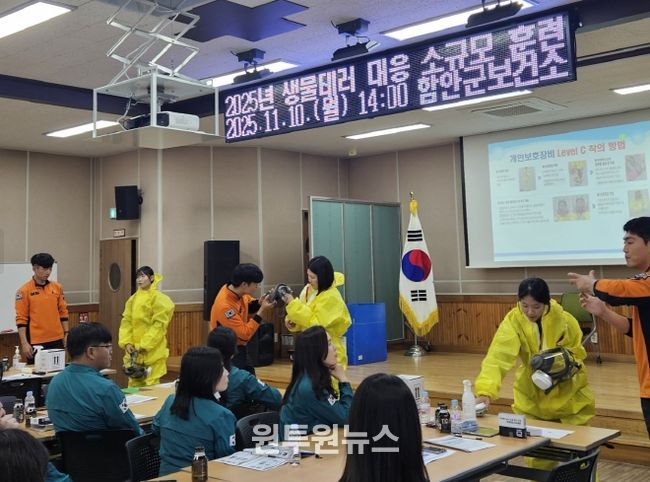 (원투원뉴스) 함안군보건소는 지난 10일 오후 2시부터 5시까지 보건소 3층 보건교육장에서 ‘2025년 생물테러 대응 소규모 합동훈련’을 실시했다고 밝혔다.