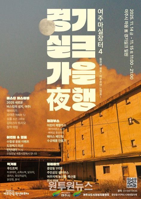 (원투원뉴스) 여주시는 오는 11월 14일부터 15일까지 이틀간 여주 경기실크 일원(여주시 하동 123-6번지)에서 '여주마실장터4 가을야행'을 개최한다고 밝혔다. 이번 행사는 '2025 새로운 버스킹의 성지, 여주!'라는 슬로건 아래, 깊어가는 가을밤의 정취를 더할 버스킹 페스티벌과 함께 다채로운 마켓과 체험을 선보일 예정이다.