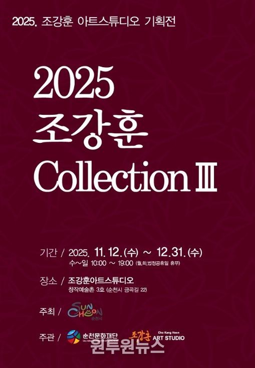 (원투원뉴스) 순천문화재단은 오는 11월 12일부터 12월 31일까지 창작예술촌 3호 조강훈 아트 스튜디오에서 ‘2025 조강훈 컬렉션Ⅲ’ 전시를 개최한다.