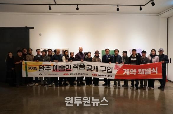 (원투원뉴스) (재)완주문화재단은 10월 31일 복합문화지구 누에아트홀에서 [2025 완주 예술인 작품 공개 구입] 최종 선정 작가들과 작품 구입 계약 체결식을 개최했다.