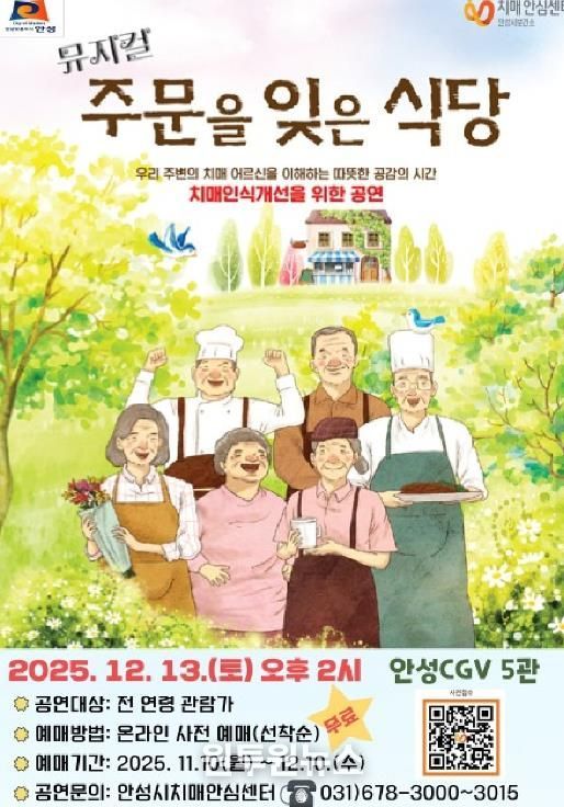 (원투원뉴스) 안성시보건소 치매안심센터는 오는 12월 13일 오후 2시, 안성 CGV에서 치매에 대한 올바른 이해와 공감 확산을 위한 치매인식개선 뮤지컬 '주문을 잊은 식당'공연을 무료로 개최한다.