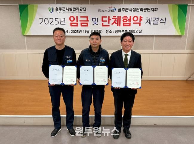 (원투원뉴스) 울주군시설관리공단과 전국공공운수사회서비스노동조합은 11월 11일 공단 본부 대회의실에서 “2025년 임금·단체협약”을 체결했다.