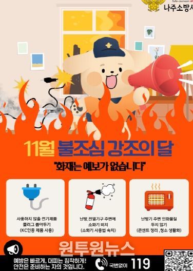 (원투원뉴스) 나주소방서(서장 신향식)는 겨울철을 앞두고 화재 발생 위험이 높아지는 시기에 맞춰 ‘11월 불조심 강조의 달’을 운영하여 시민 모두가 함께 실천하는 안전한 난방·전기 화재 예방을 당부했다.