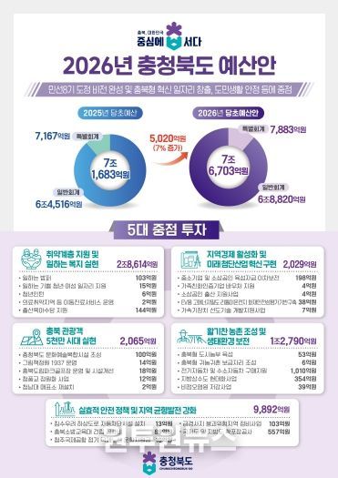 (원투원뉴스) 충청북도는 민선8기 도정 비전 완성 및 충북형 혁신 일자리 창출, 도민 생활 안정 등을 위해 2026년도 예산안을 편성하여 11월 11일 충청북도의회에 제출했다.