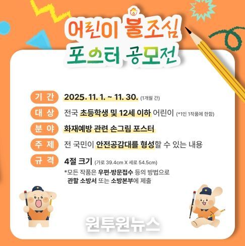 (원투원뉴스) 해남소방서가 11월 불조심 강조의달을 맞아 이달 21일까지 지역 내 초등학생 및 12세 이하 어린이를 대상으로 불조심 포스터 공모전을 개최한다.