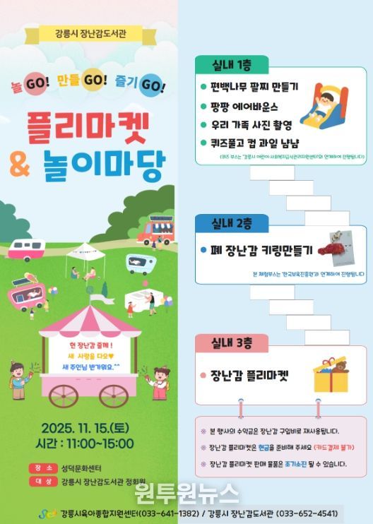 (원투원뉴스) 강릉시는 오는 15일 오전 11시부터 오후 3시까지 성덕동문화센터에서 ‘강릉시장난감도서관 플리마켓 · 놀이마당’ 행사를 개최한다.