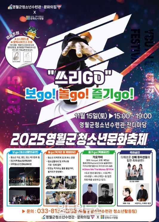 (원투원뉴스) 영월군청소년수련관·영월군청소년문화의집 공동 주관하는 2025년 영월군청소년문화축제『“쓰리GO”(보go·놀go·즐기go)』가 오는 11월 15일 오후 3시부터 영월군청소년수련관 잔디마당 일대에서 청소년과 지역 군민을 대상으로 개최된다.