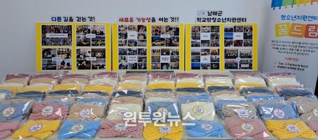 (원투원뉴스) 남해군 학교밖청소년지원센터 봉사동아리가 11일 지역 내 홀몸 어르신들을 위해 직접 제작한 목도리 100개를 기부했다.