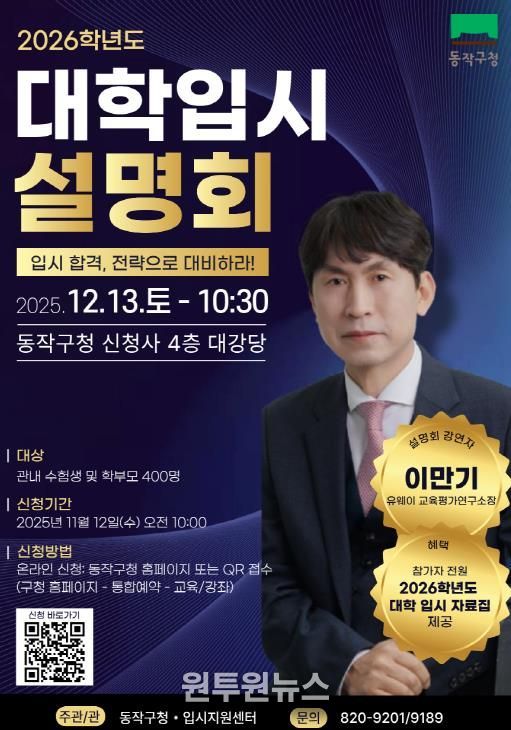 (원투원뉴스) 동작구는 2026학년도 대학입시를 준비하는 관내 수험생과 학부모를 대상으로 ‘정시전형 입시설명회’를 개최한다고 밝혔다.