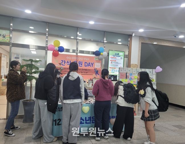 (원투원뉴스) 금산군청소년미래센터는 수능을 준비하는 고3 수험생과 시설 이용 청소년들을 위해 지난 11일 센터 로비에서 ‘간식 응원데이’를 개최했다.