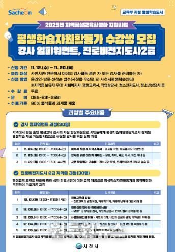 (원투원뉴스) 사천시는 평생학습도시 신규 지정으로 ‘평생학습자원활동가 양성과정’ 수강생을 11월 12일부터 20일까지 모집한다.