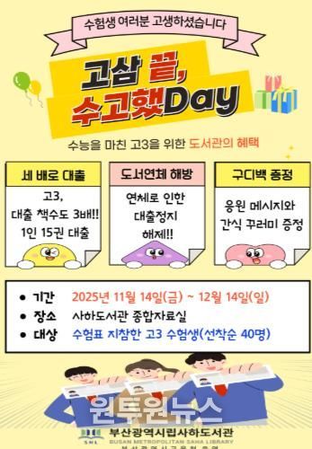 (원투원뉴스) 부산광역시립사하도서관은 오는 14일부터 12월 14일까지 사하도서관에서 대학수학능력시험을 마친 고3 수험생 40명을 대상으로 ‘고삼 끝, 수고했Day’ 행사를 운영한다.