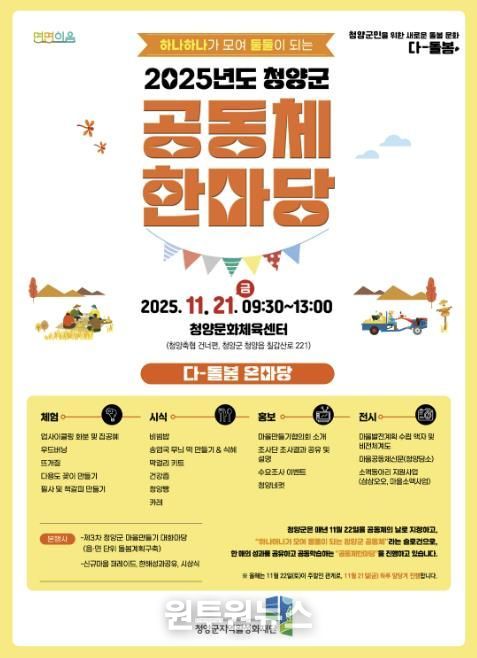 (원투원뉴스) 청양군지역활성화재단은 지역 공동체 발전을 위한 한 해의 성과를 공유하고 상호 학습을 통해 지속 가능한 발전을 도모하기 위해 ‘2025 청양군 공동체한마당’을 개최한다.