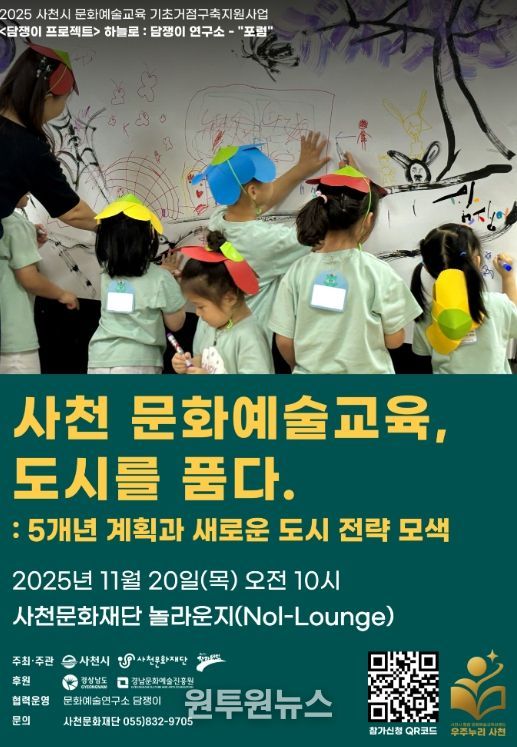 (원투원뉴스) 사천문화재단이 오는 11월 20일 오전 10시, 사천문화재단 놀라운지에서 “사천 문화예술교육, 도시를 품다 : 5개년 계획과 새로운 도시 전략 모색”을 주제로 한 포럼을 통해 문화예술교육을 도시 발전의 핵심 동력으로 삼기 위한 중장기 전략을 공개한다.