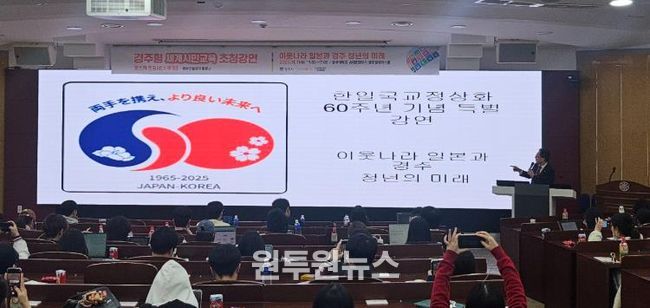 이번 강연은 ‘이웃나라의 이해와 경주 청년의 미래’를 주제로, 글로벌 시대를 살아가는 청년들에게 필요한 세계시민의 자질을 모색하고 한일 양국의 지속 가능한 협력 방향을 함께 논의하기 위해 마련됐다.