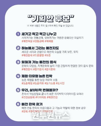 (원투원뉴스) 예천군과 (재)예천문화관광재단은 ‘문화특화지역 조성사업’의 일환으로 운영된 문화기획학교 '문화, 배울 수(水) 있지' 2기의 결과물인 문화기획 아이디어 제안 6건을 대상으로 한 공개투표를 오는 24일까지 진행한다고 밝혔다.