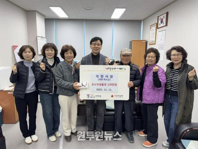 (원투원뉴스) 구리시 수택1동 행정복지센터는 지난 11월 11일, 수택1동 나눔 모임 ‘착한 사람’(대표 박수근)으로부터 온누리상품권 120만 원을 기탁받았다고 밝혔다.