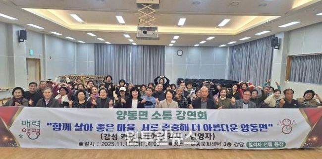 (원투원뉴스) 양평군 양동면은 11일 오후 2시 양동문화센터 3층 대강당에서 ‘함께 살아 좋은 마을, 서로 존중해 더 아름다운 양동면’을 주제로 소통강연회를 개최했다.