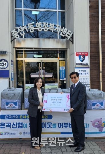 이날 은곡신협 유재원 이사장이 직접 행정복지센터에 방문했으며 에너지 취약계층의 따뜻한 겨울나기를 도울 겨울이불 20채를 중산1동에 전달했다.