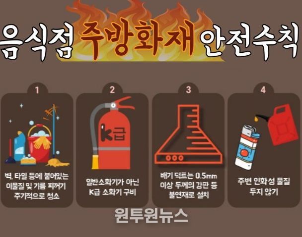 김종욱 천안서북소방서장은 “음식점 주방은 화기 사용이 많고 기름이 쉽게 쌓이는 환경인 만큼, 주기적인 청소와 함께 K급 소화기 비치가 필수”라며 “조리 중 자리를 비우지 않고 주변에 인화성 물질을 두지 않는 등 기본 안전수칙을 준수해 달라”고 당부했다.