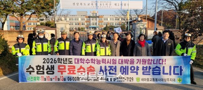 이번 활동은 교통이 불편한 농촌지역 수험생과 시내권 학생들의 원활한 등교를 지원하기 위해 마련된 것으로, 새마을교통봉사대원 20여 명이 참여해 자가용 승합차와 택시를 활용한 무료 수송 서비스를 제공하며 시험장 주변 교통안전 지도 및 질서유지 활동을 병행했다.