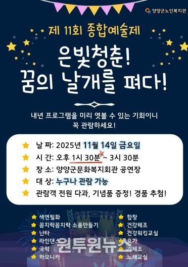 (원투원뉴스) 양양군은 오는 11월 14일 오후 1시 30분 양양군문화복지회관에서 ‘제11회 종합예술제—은빛청춘, 꿈의 날개를 펴다’ 를 개최한다.