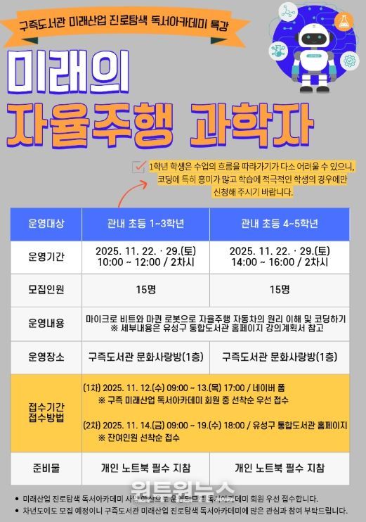 (원투원뉴스) 대전 유성구 오는 22일과 29일 구즉도서관에서 관내 초등학생을 대상으로 ‘미래의 자율주행 과학자’ 과학 특강을 운영한다.