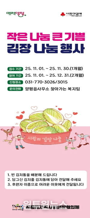 (원투원뉴스) 양평군 양평읍은 11월 1일부터 12월 31일까지 두 달간 ‘작은 나눔, 큰 기쁨 김장 나눔 사업’을 추진하며, 관내 취약계층 이웃들에게 정성 가득한 김장김치를 전달한다고 밝혔다.