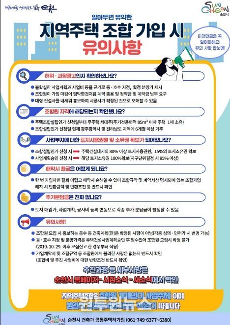 (원투원뉴스) 순천시는 최근 지역주택조합 아파트 사업과 관련해 과장 광고나 불충분한 정보 제공으로 인한 시민들의 피해가 우려된다며, 조합 가입 전 철저한 확인을 당부했다.