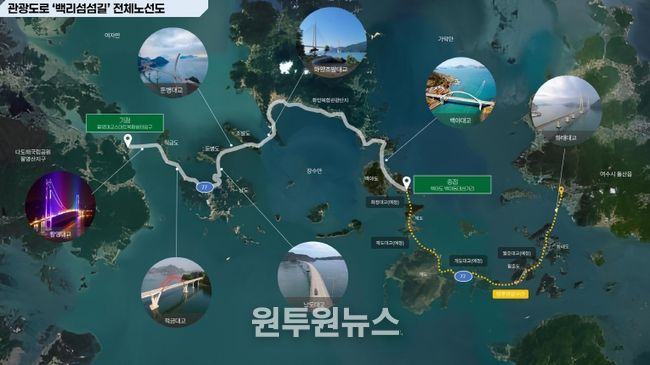 이번에 지정된 백리섬섬길은 여수 백야도에서 고흥 영남까지 23km 구간의 국도 77호선으로 6개의 연륙·연도교를 따라 이어지는 해양경관 명품 도로다. 남해안의 다도해 절경과 섬 문화, 해양 생태를 한눈에 감상할 수 있으며, 섬과 섬을 따라 다양한 체류형 관광상품 개발이 가능한 대한민국 대표 해안관광 루트로 평가된다.