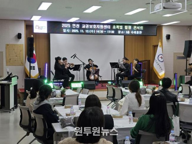 (원투원뉴스) 경기도연천교육지원청 교권보호지원센터는 2025년 11월 12일 연천교육지원청 3층 수레울관에서 교원의 정서 회복과 마음 치유를 위한 '초록빛 힐링 콘서트'를 진행했다.
